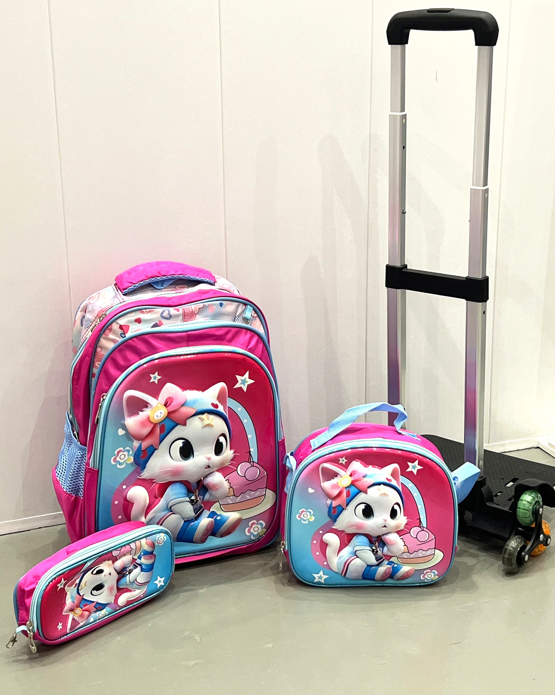 3-in-1 Detachable Trolley Schoolbag Set for Kids – Rolling Backpack with Lunch Bag & Pencil Case - 25-JZ2003-19 Cute Cat